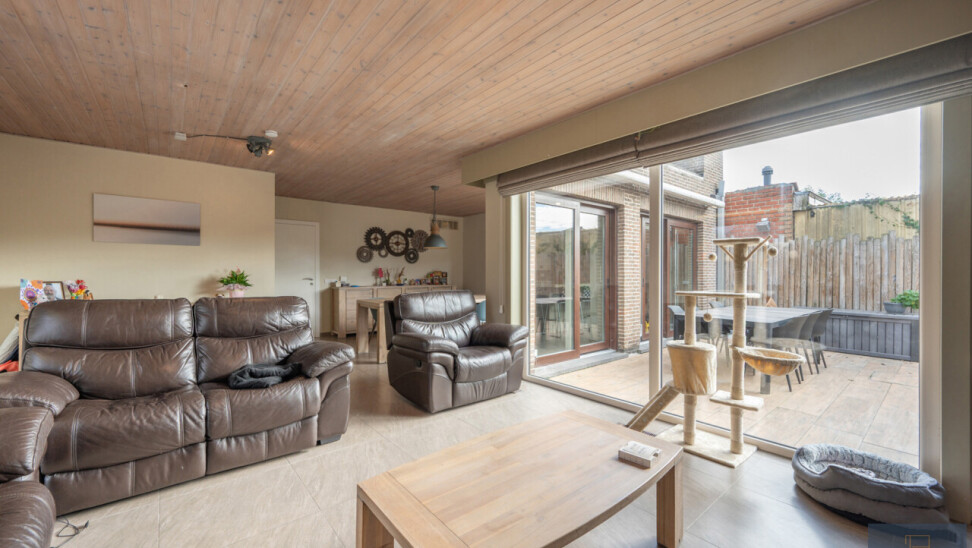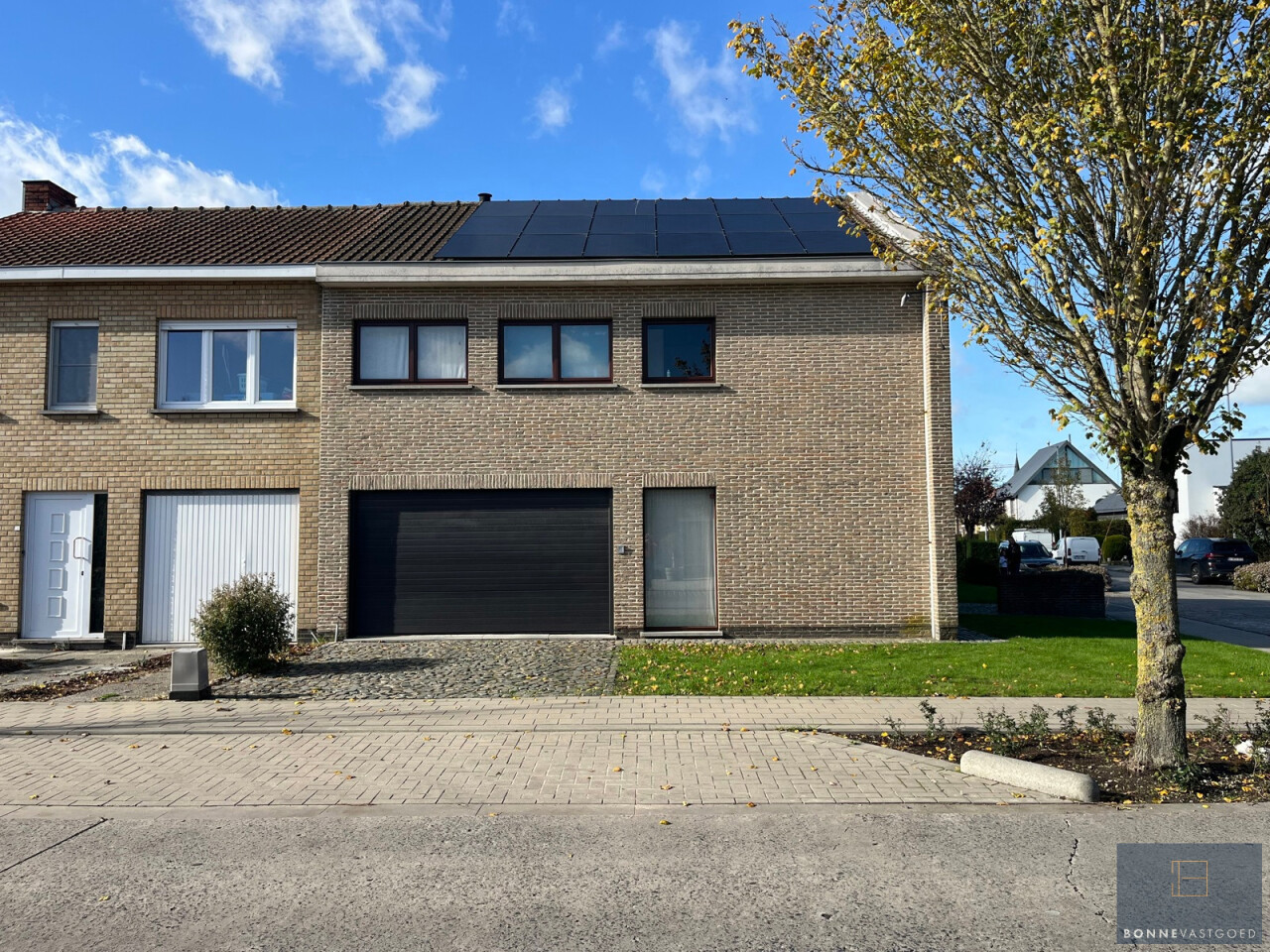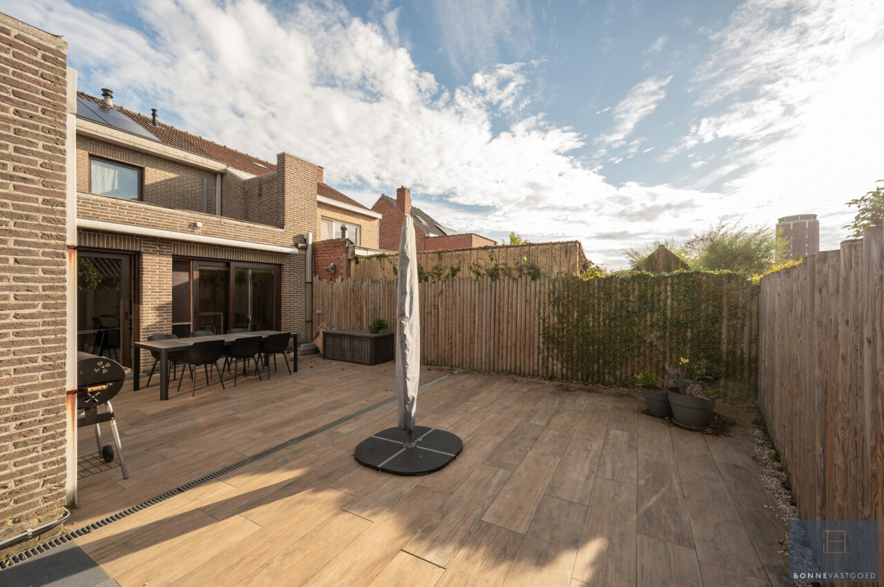 Buiten: voortuin met oprit, achtertuin (volledig omheid + onderhoudsvrij), met terras en zonneluifel.