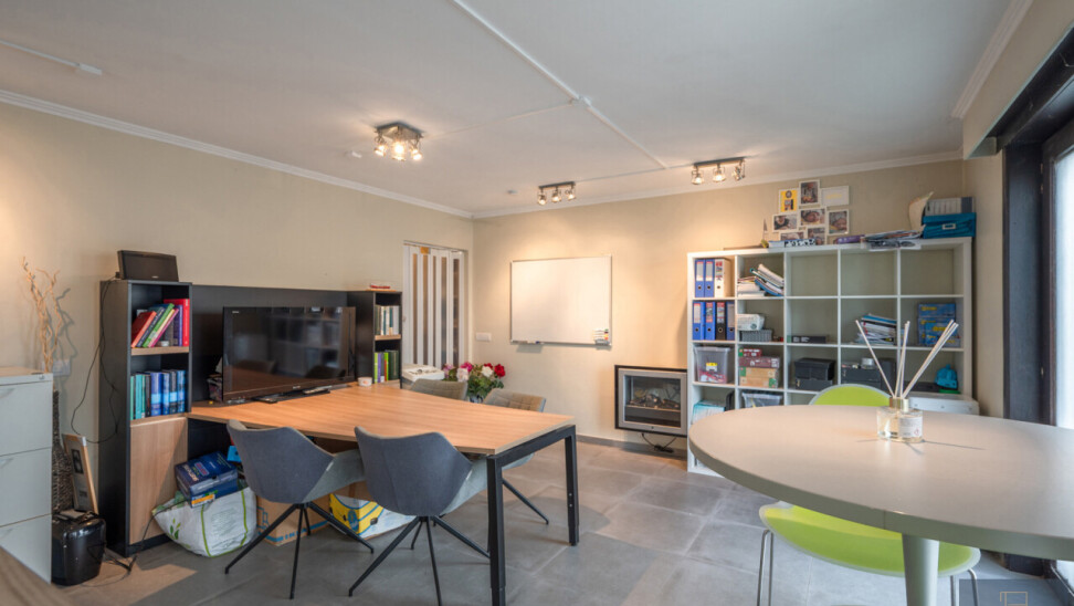 Gelijkvloers: inkom, gastentoilet, leefruimte, open keuken (Dovy- met eiland, kookplaat, dampkap, oven, microgolfoven, koelkast en spoelzone), berging (met aansluitingen wasmachine, droogkast en waterverzachter), garage met nieuwe automatische poort. Naarnaast is er het kantoor met de aparte toegangsdeur.