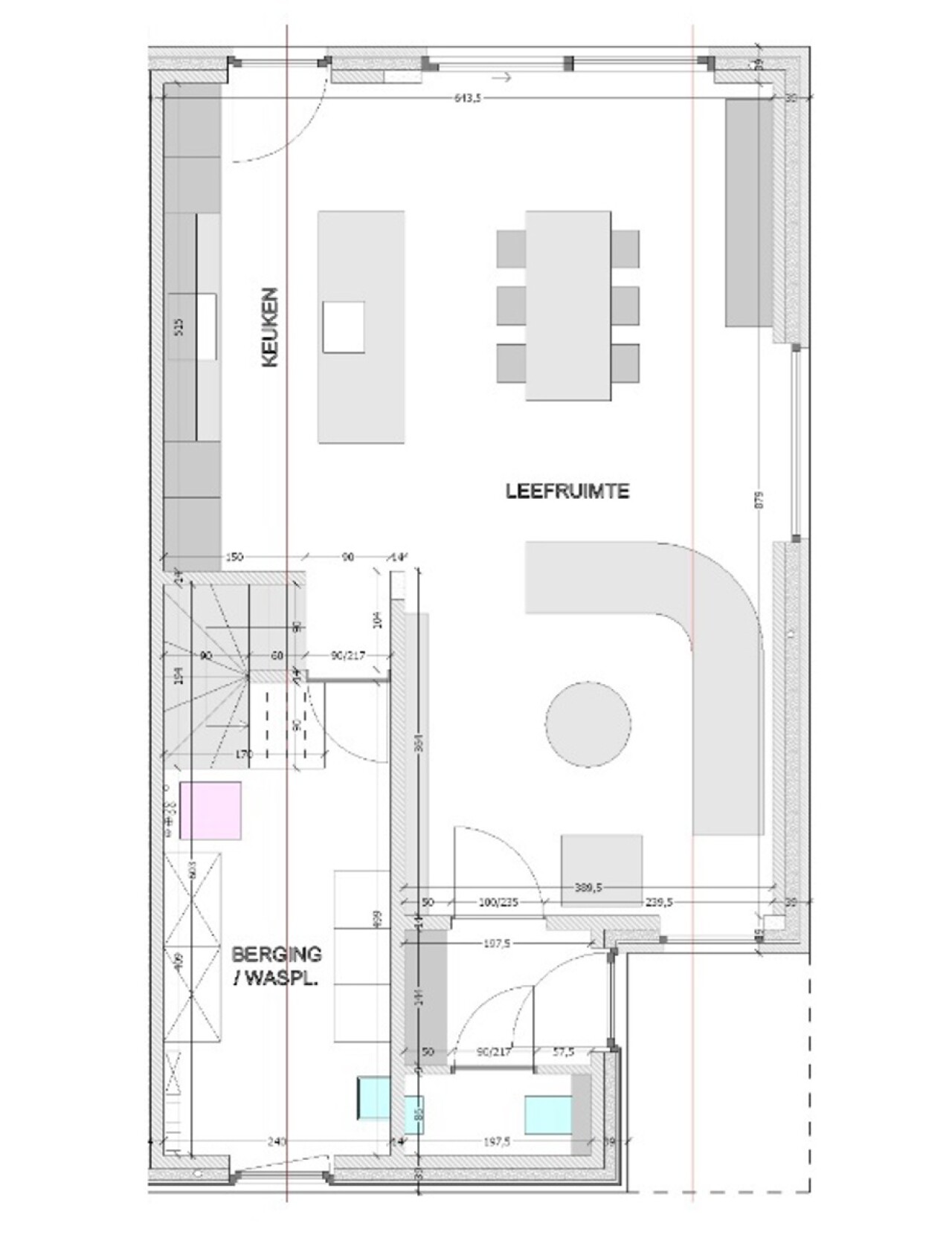 Gelijkvloers: inkomhal, gastentoilet, lichtrijke leefruimte (47m² - met zithoek, eetplaats en open keuken). Verder is een ruime berging met wasplaats en achterdeur op het gelijkvloers te vinden.