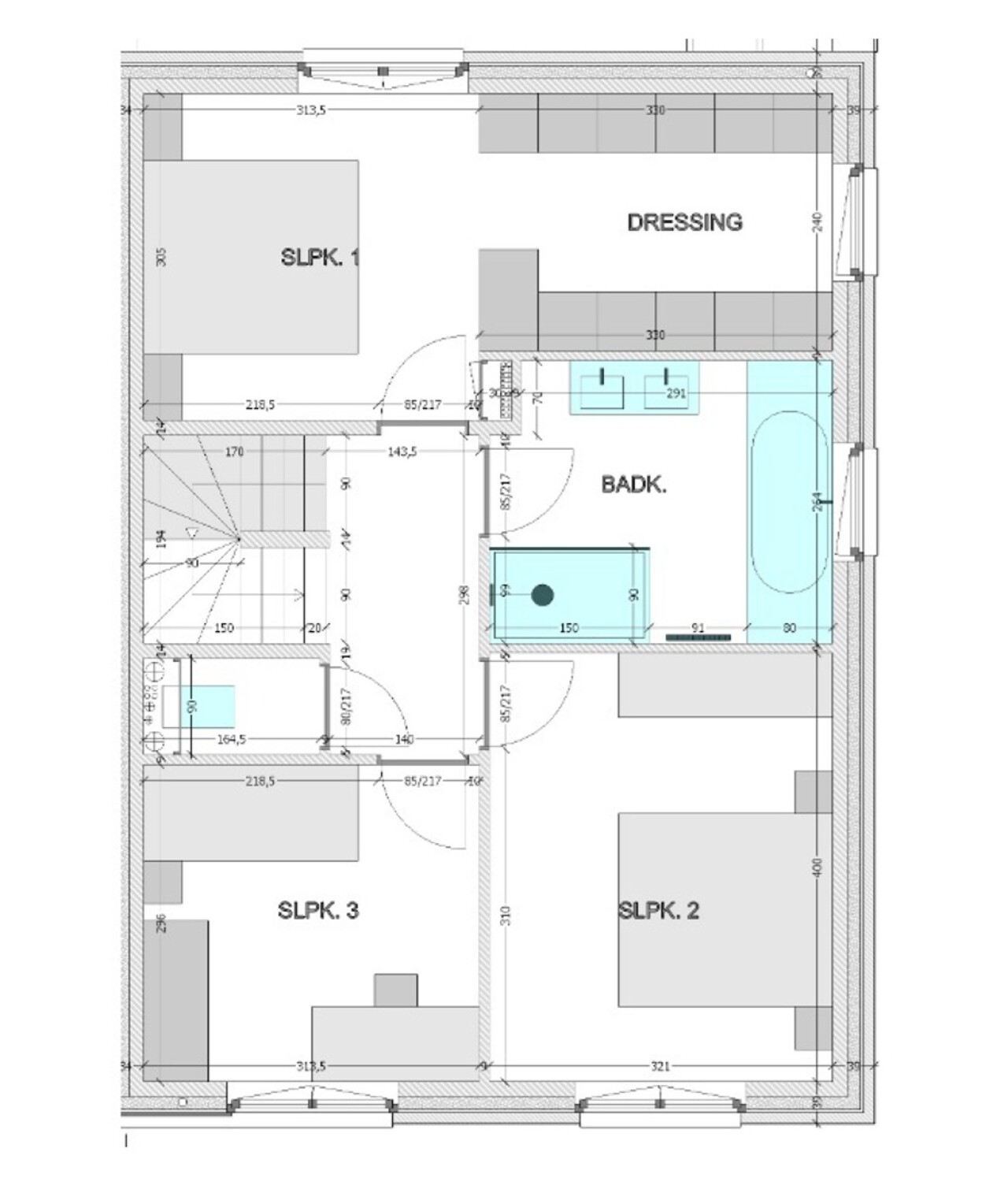 Eerste verdieping: hoofdslaapkamer (17m² - met plaats voor dressing), 2 kinderkamers (13 en 9,5m²), toilet en badkamer (met inloopdouche, ligbad, dubbel lavabomeubel). Daarnaast is een vaste trap naar de 2de verdieping voorzien.