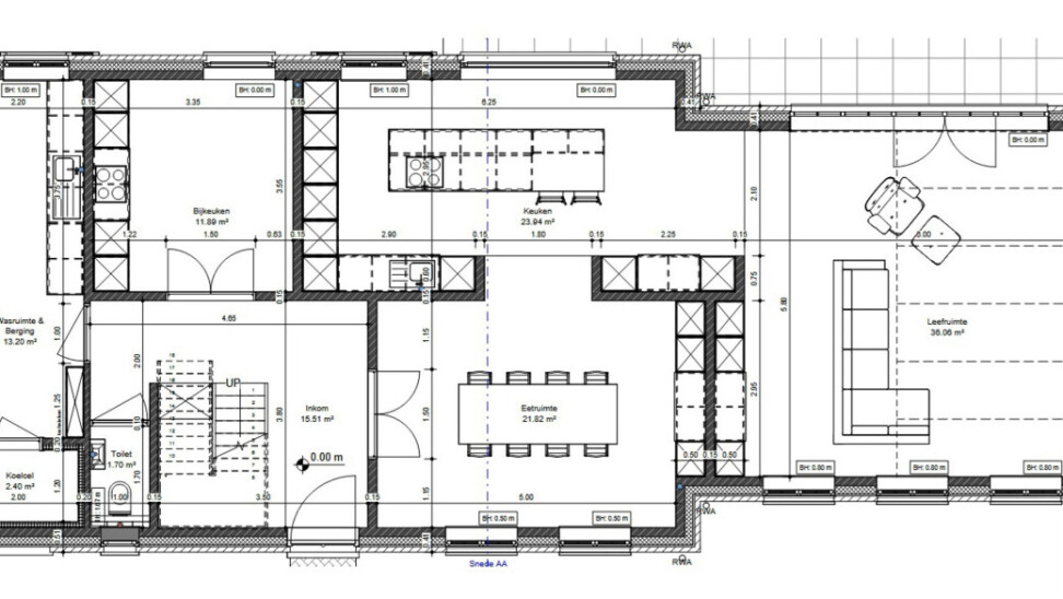-Gelijkvloers: royale inkomhal, leefruimtes opgedeeld in eetplaats, zithoek en open keuken, bijkeuken, wasplaats en koelcel.