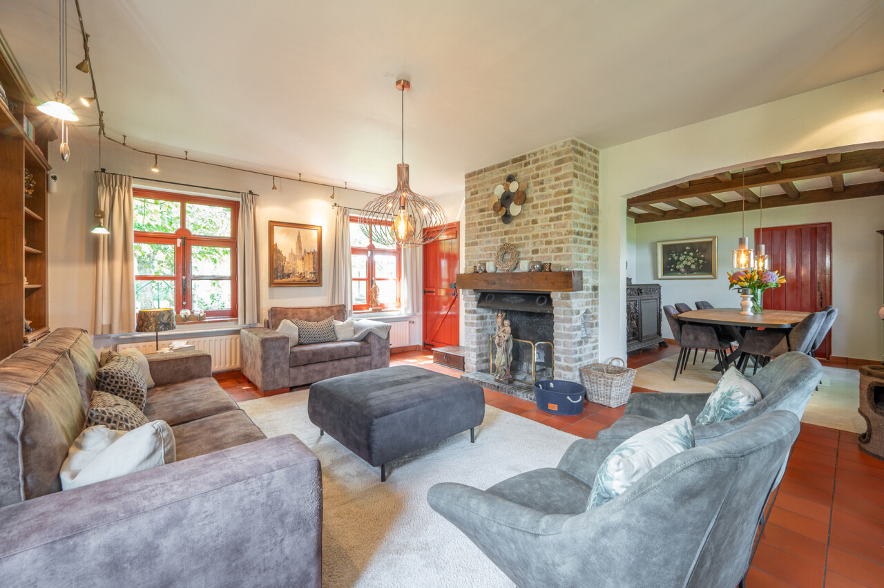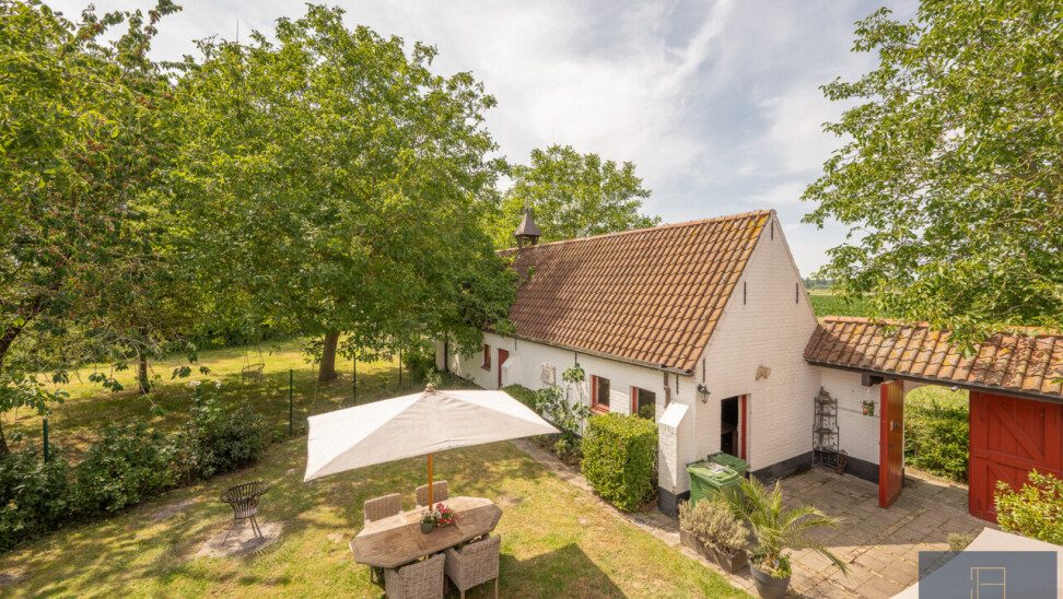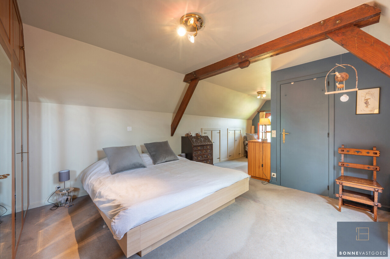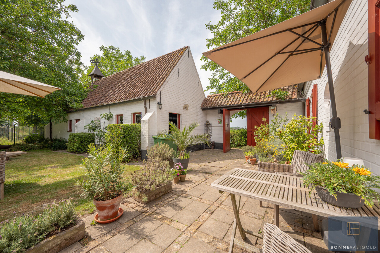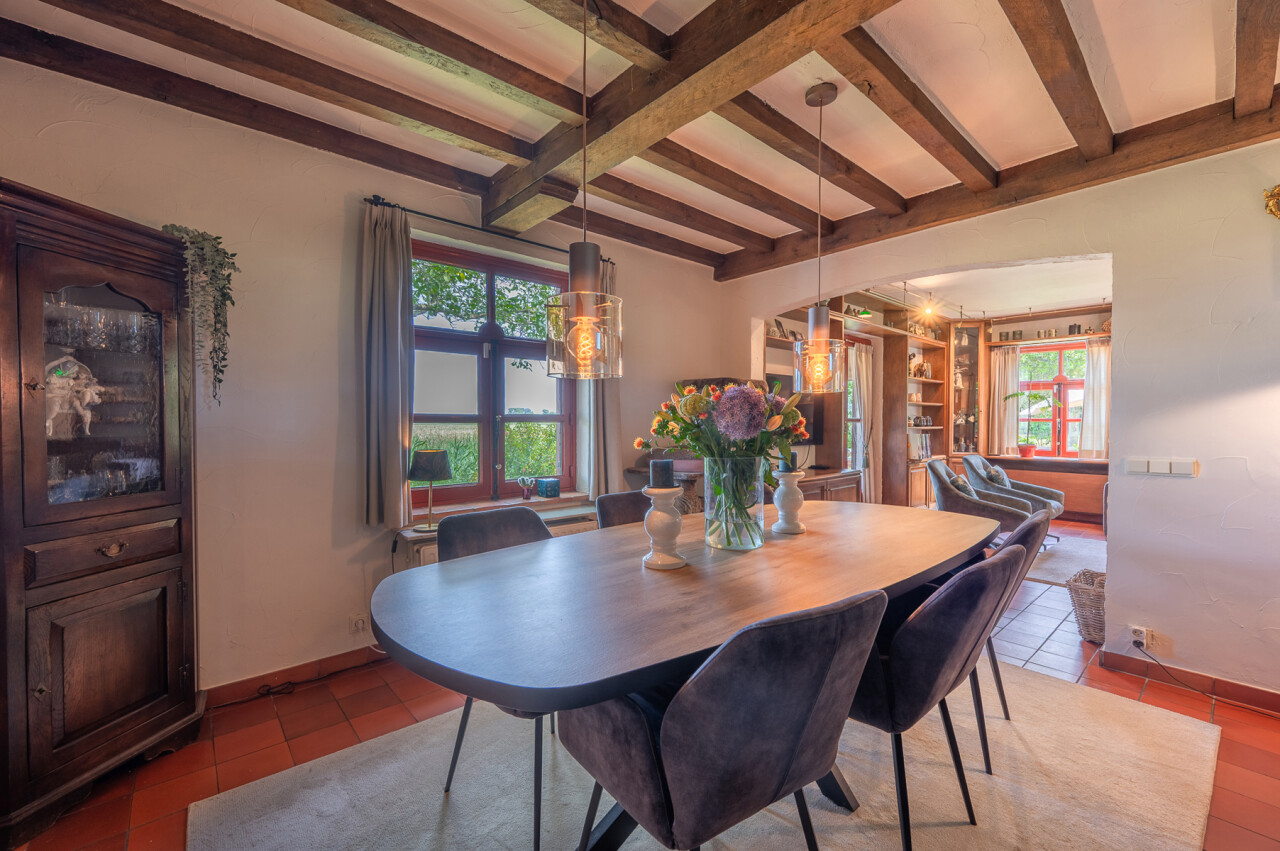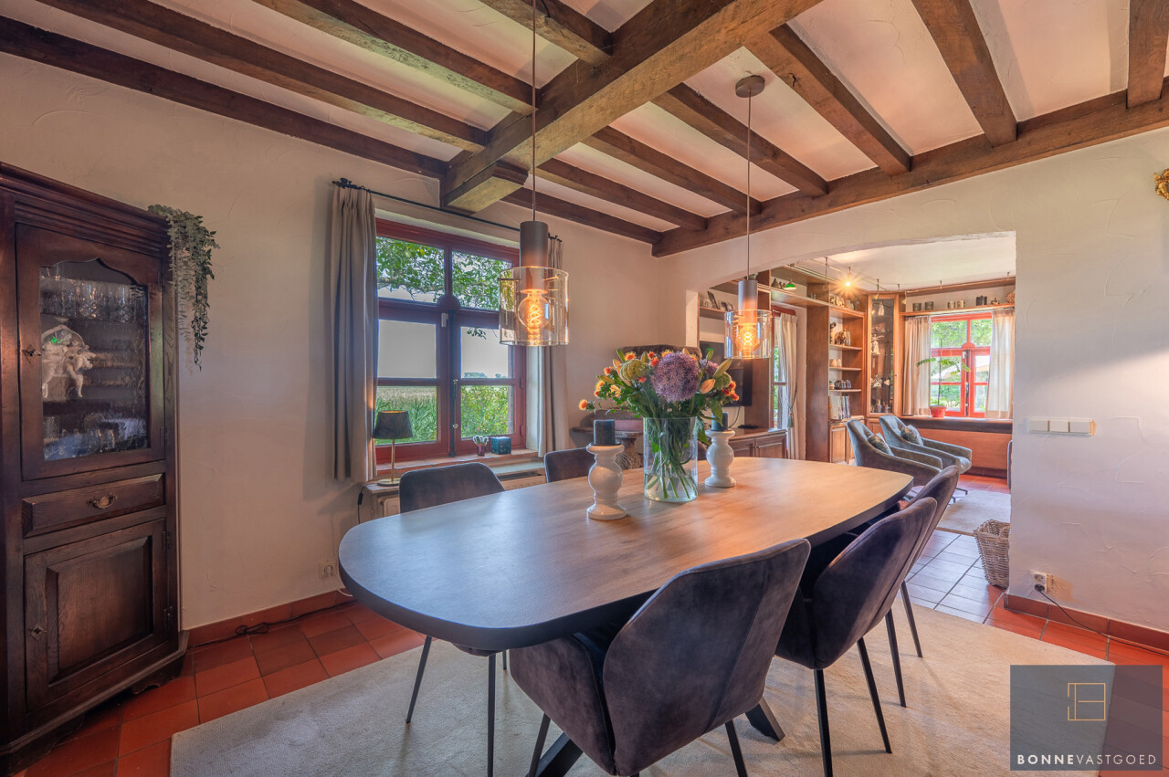 De typische landelijke hoevestijl dankt de woning aan z’n origine uit het begin van de 20ste eeuw. De voorbije decennia werd het woongedeelte volledig heropgebouwd naar moderne normen. Kwaliteit en degelijkheid werden hierbij hoog in het vaandel gedragen. Getuigen hiervan; de betonnen tussenverdieping, de vele maatkasten voor optimaal ruimtegebruik, de karakteriserende massieve binnendeuren, het monumentale balkwerk, voleiken parketvloeren, de gezellige haard,.. . Onlangs nog werden de 3 badkamers vernieuwd met mortex afwerking.
