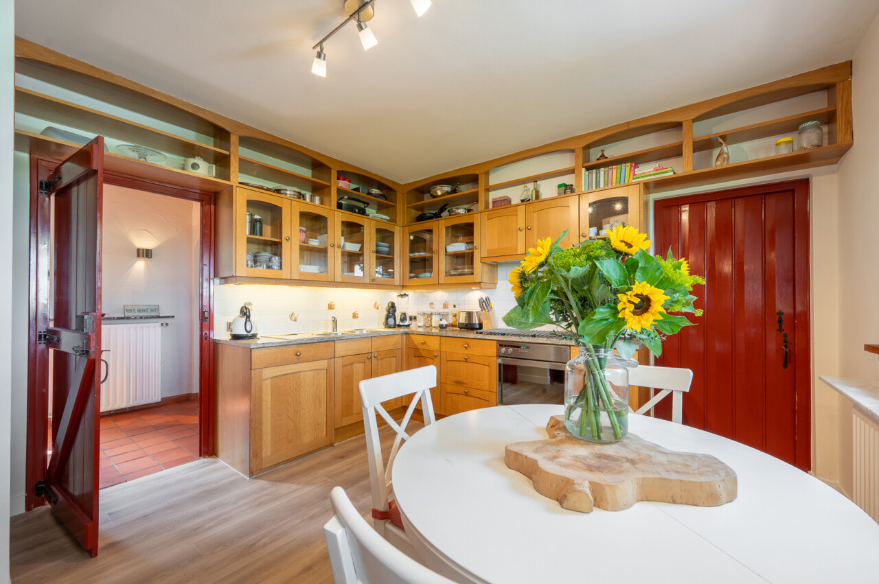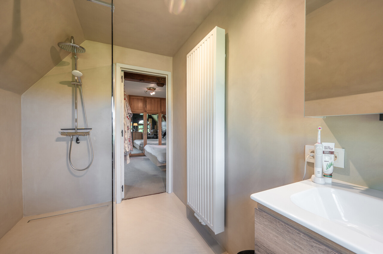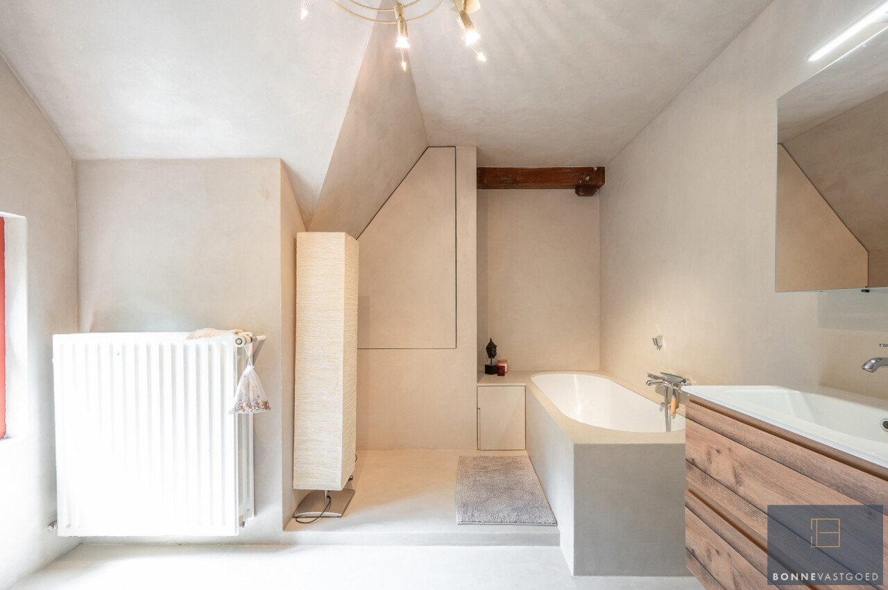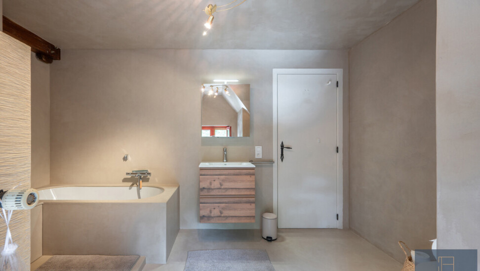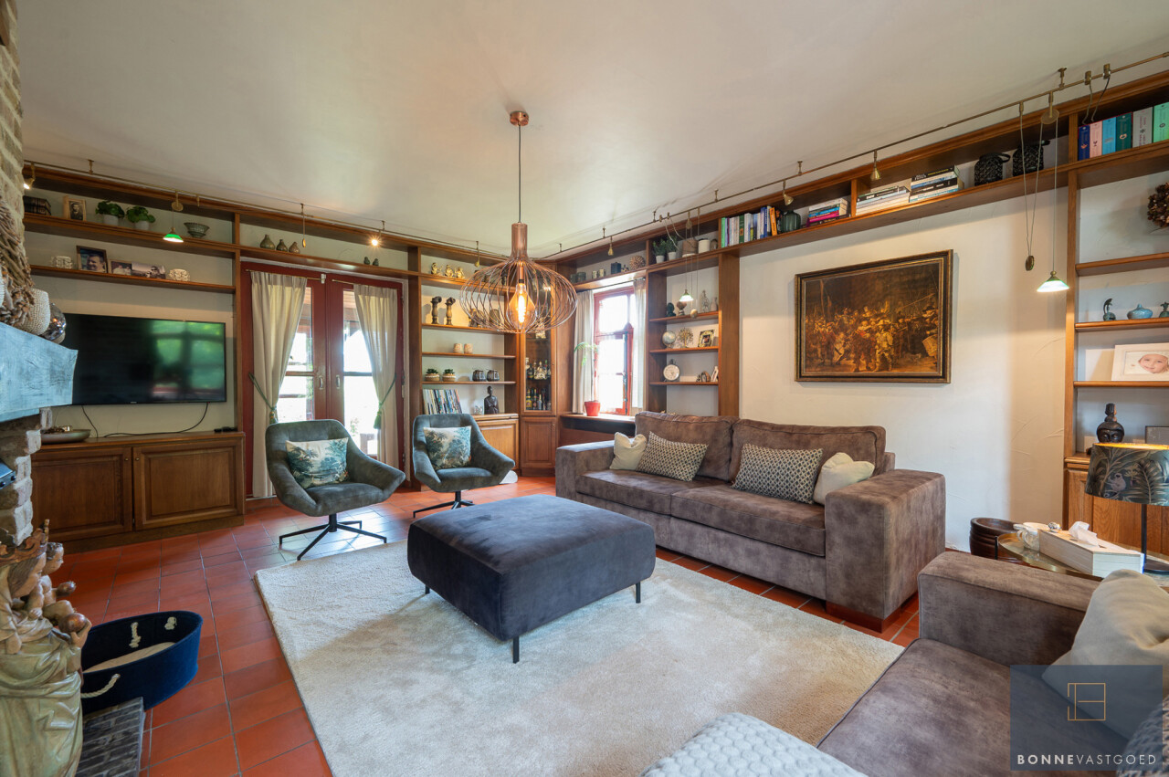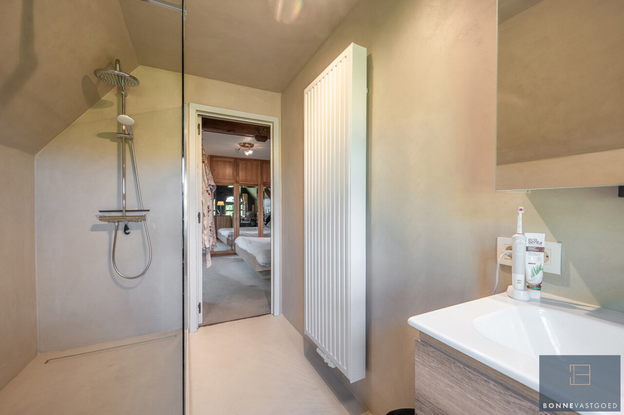 De typische landelijke hoevestijl dankt de woning aan z’n origine uit het begin van de 20ste eeuw. De voorbije decennia werd het woongedeelte volledig heropgebouwd naar moderne normen. Kwaliteit en degelijkheid werden hierbij hoog in het vaandel gedragen. Getuigen hiervan; de betonnen tussenverdieping, de vele maatkasten voor optimaal ruimtegebruik, de karakteriserende massieve binnendeuren, het monumentale balkwerk, voleiken parketvloeren, de gezellige haard,.. . Onlangs nog werden de 3 badkamers vernieuwd met mortex afwerking.