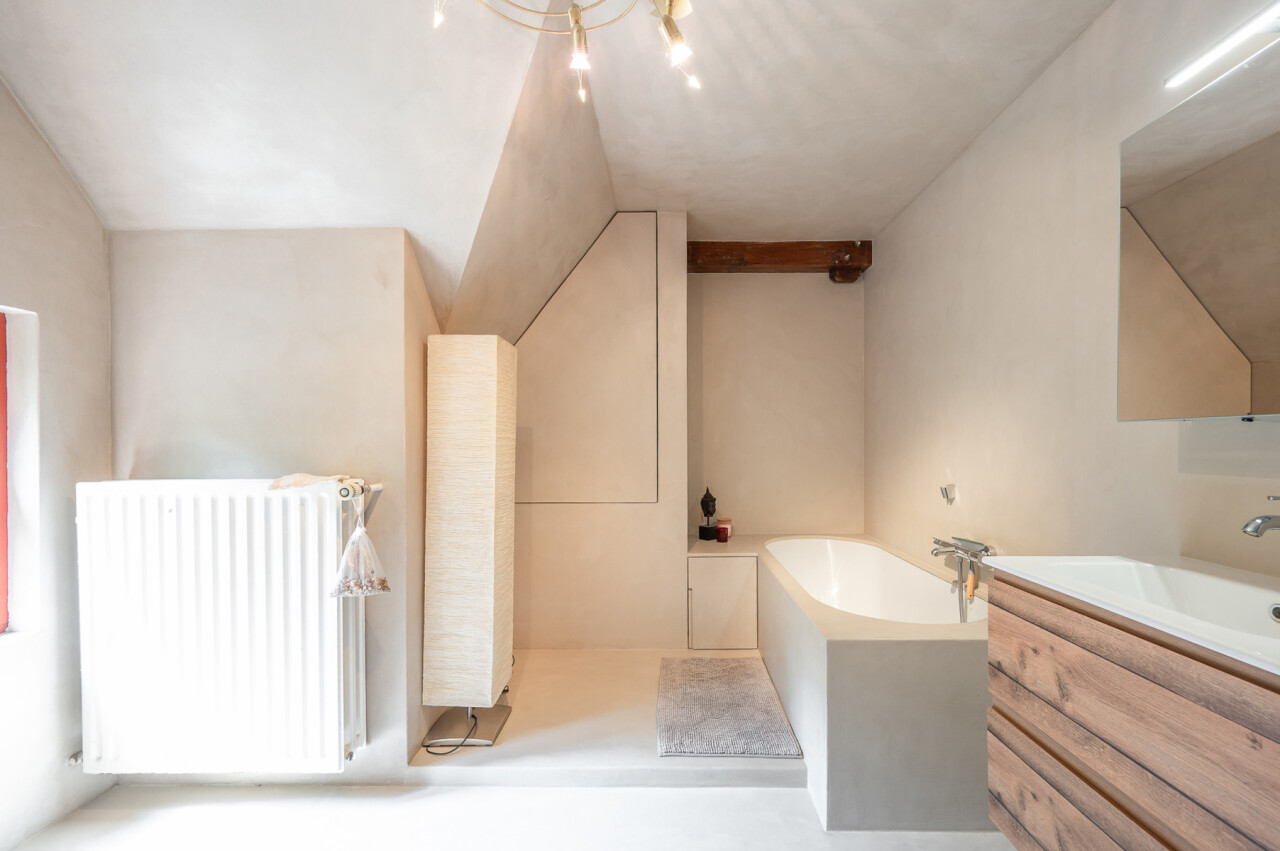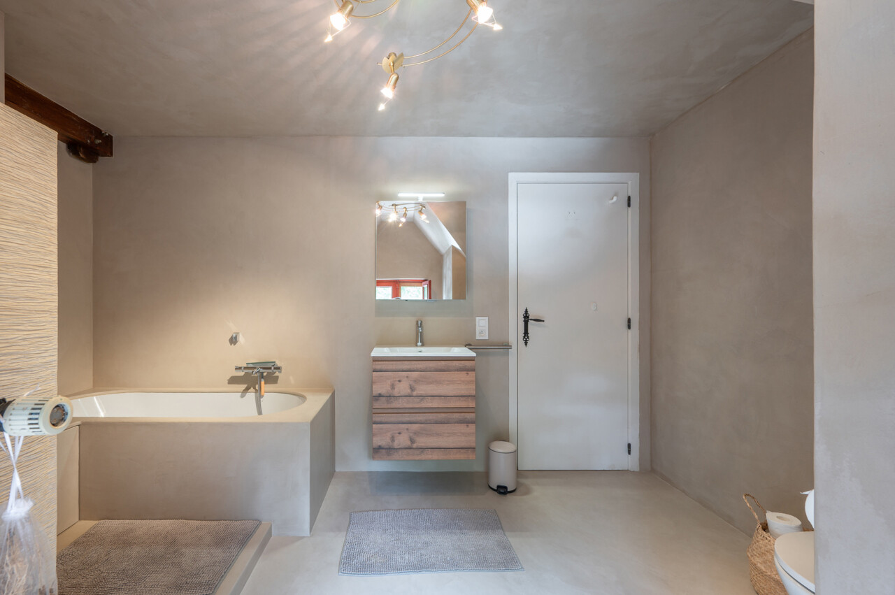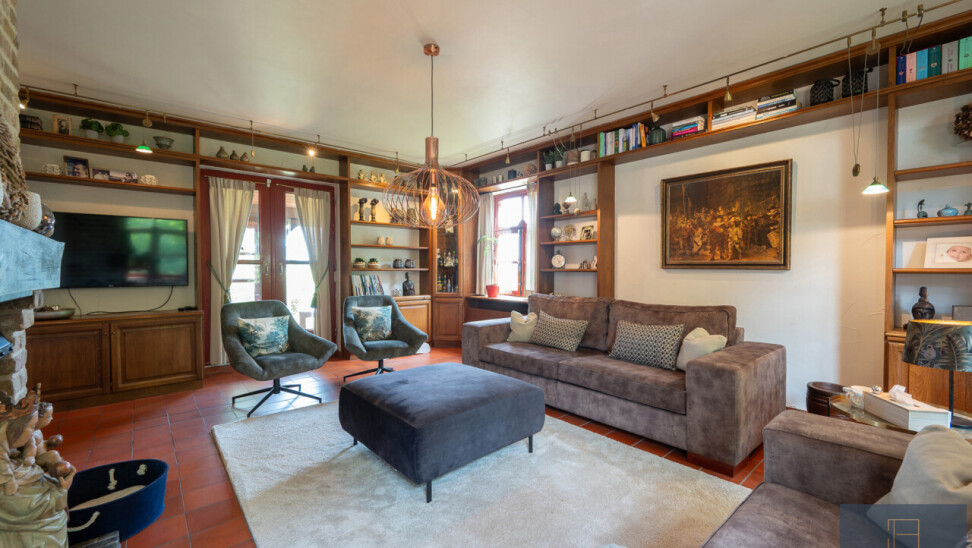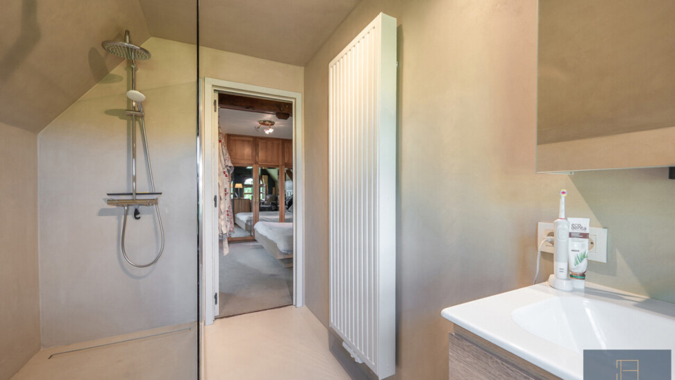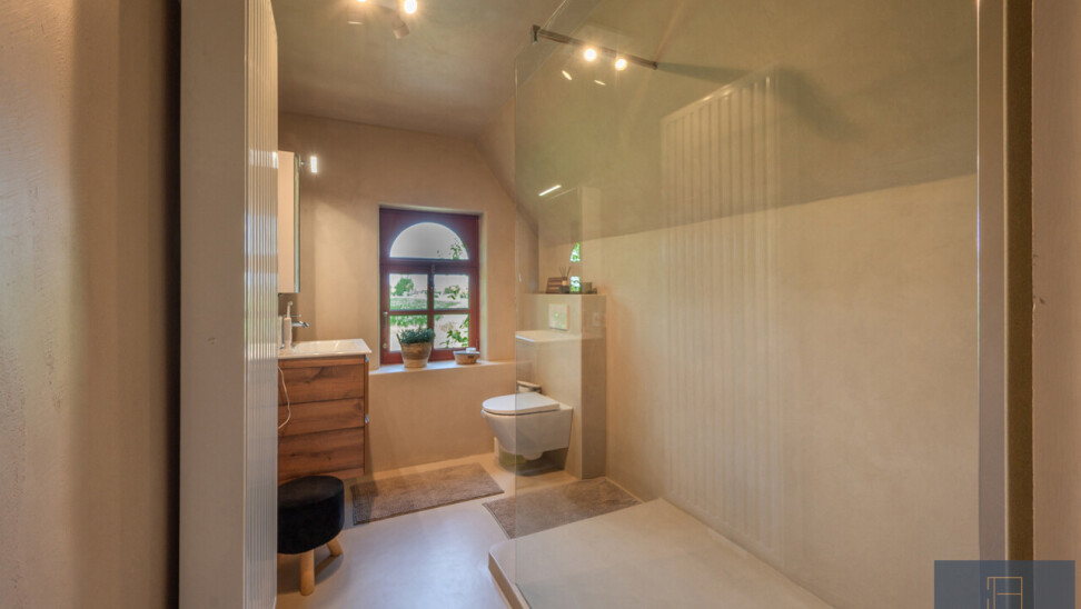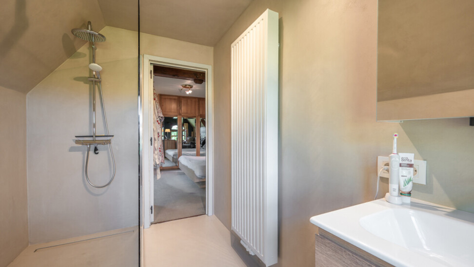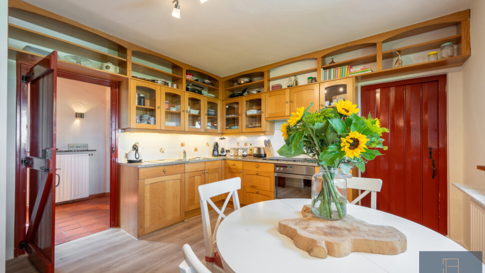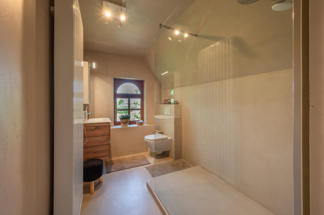 De typische landelijke hoevestijl dankt de woning aan z’n origine uit het begin van de 20ste eeuw. De voorbije decennia werd het woongedeelte volledig heropgebouwd naar moderne normen. Kwaliteit en degelijkheid werden hierbij hoog in het vaandel gedragen. Getuigen hiervan; de betonnen tussenverdieping, de vele maatkasten voor optimaal ruimtegebruik, de karakteriserende massieve binnendeuren, het monumentale balkwerk, voleiken parketvloeren, de gezellige haard,.. . Onlangs nog werden de 3 badkamers vernieuwd met mortex afwerking.