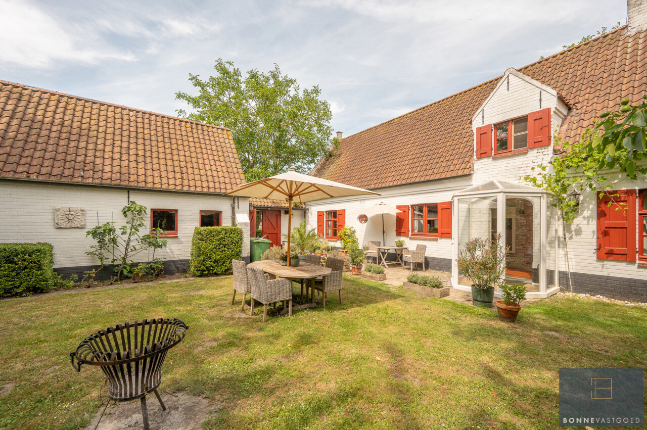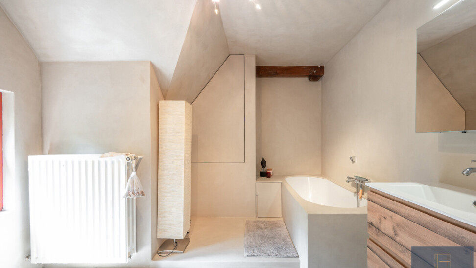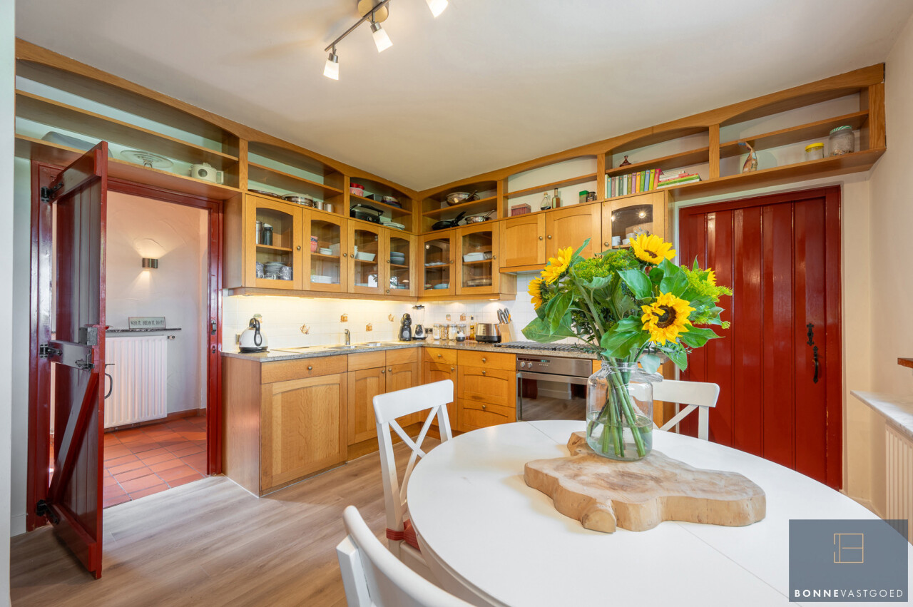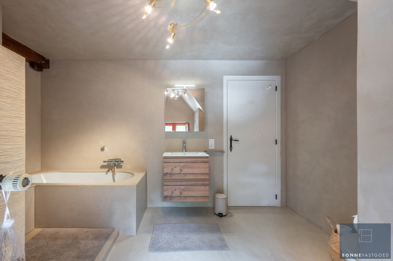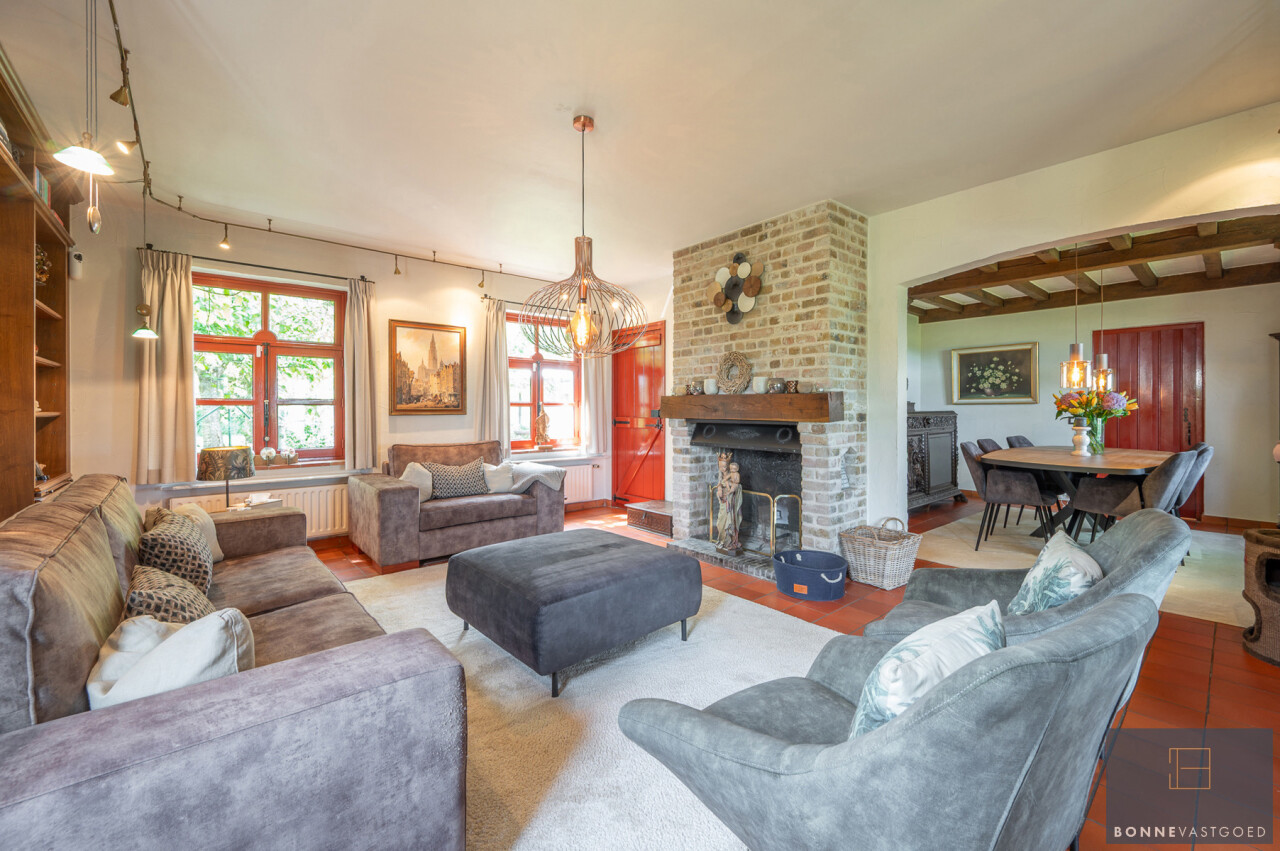 De typische landelijke hoevestijl dankt de woning aan z’n origine uit het begin van de 20ste eeuw. De voorbije decennia werd het woongedeelte volledig heropgebouwd naar moderne normen. Kwaliteit en degelijkheid werden hierbij hoog in het vaandel gedragen. Getuigen hiervan; de betonnen tussenverdieping, de vele maatkasten voor optimaal ruimtegebruik, de karakteriserende massieve binnendeuren, het monumentale balkwerk, voleiken parketvloeren, de gezellige haard,.. . Onlangs nog werden de 3 badkamers vernieuwd met mortex afwerking.
