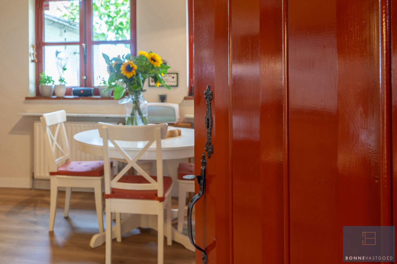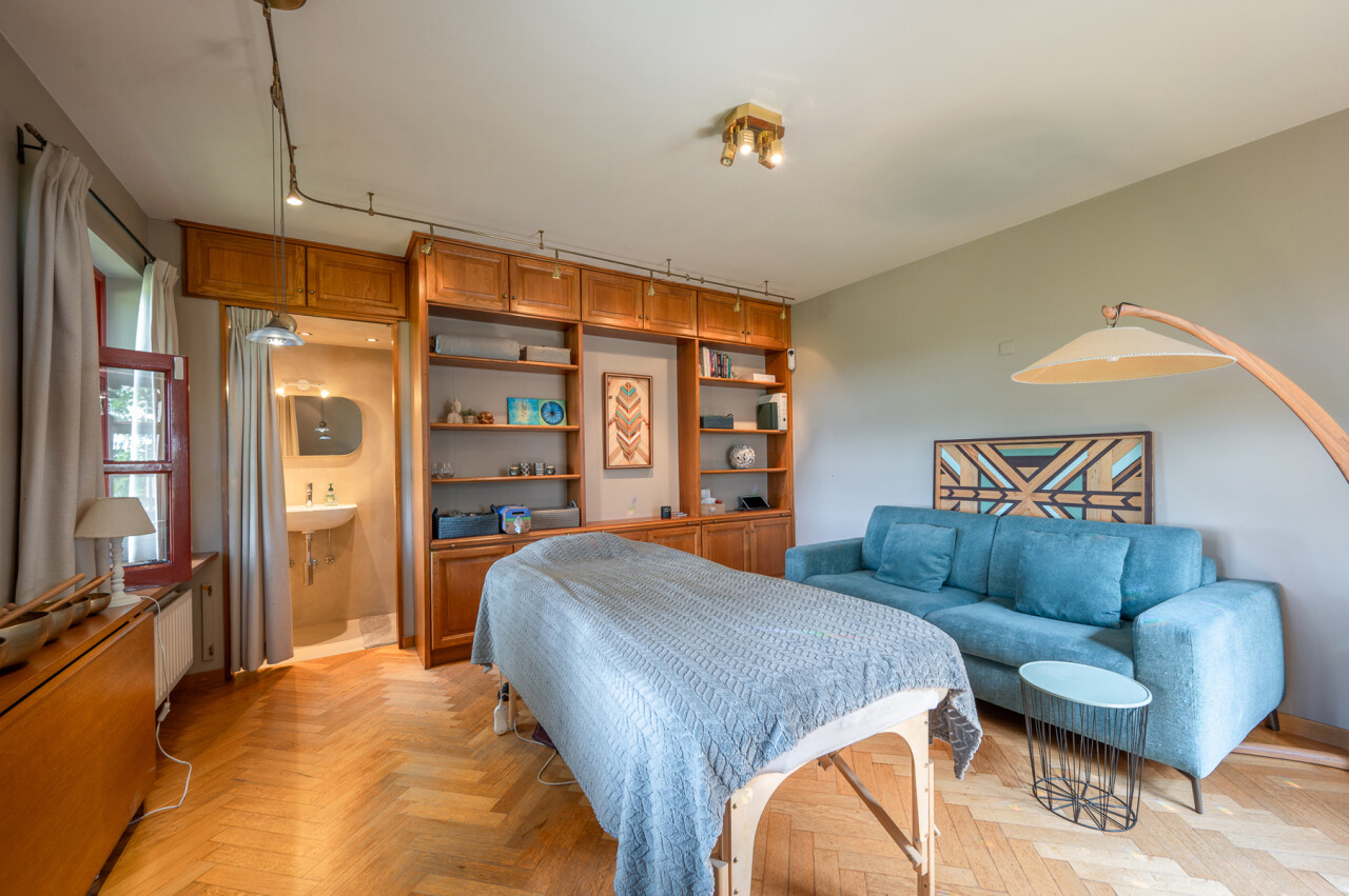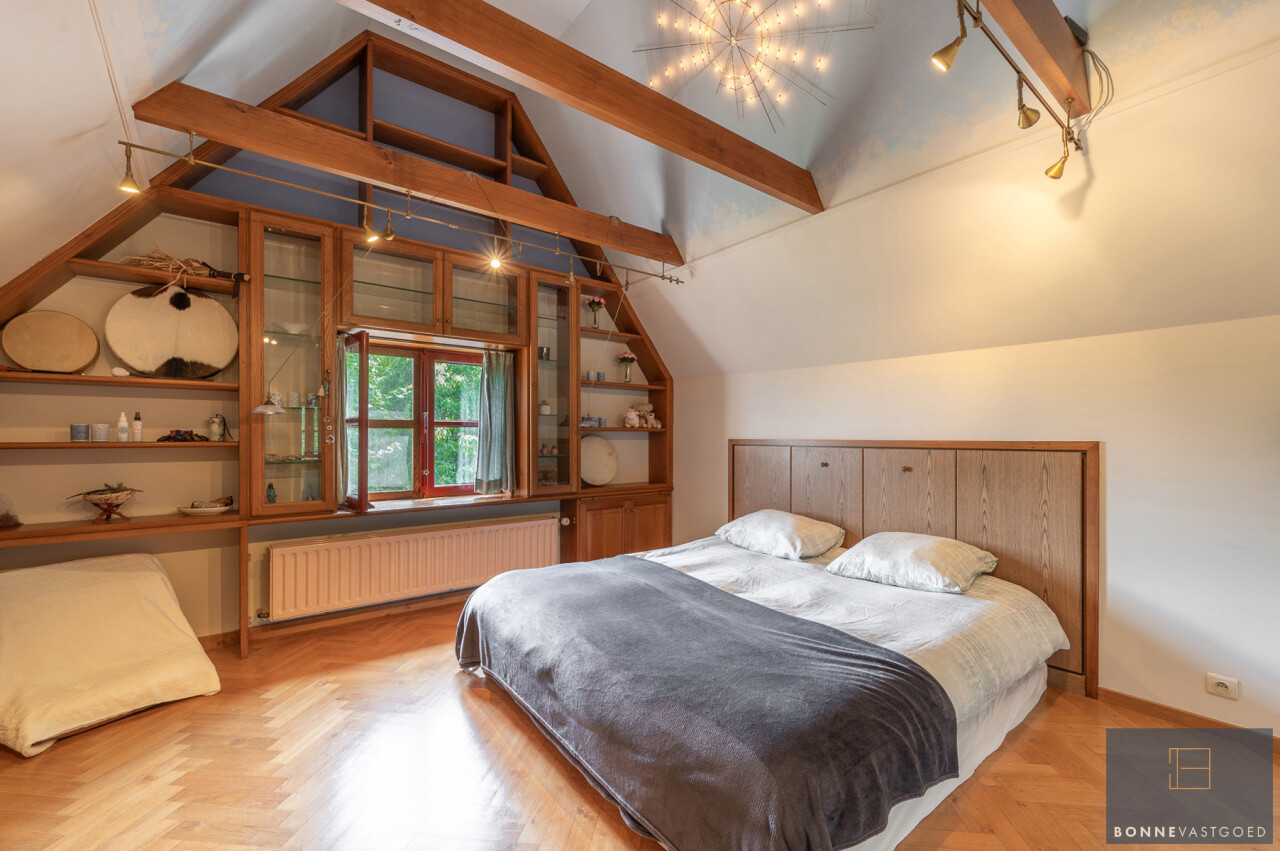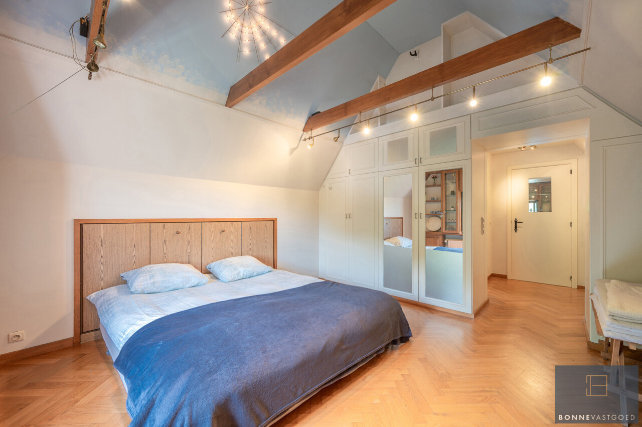 De typische landelijke hoevestijl dankt de woning aan z’n origine uit het begin van de 20ste eeuw. De voorbije decennia werd het woongedeelte volledig heropgebouwd naar moderne normen. Kwaliteit en degelijkheid werden hierbij hoog in het vaandel gedragen. Getuigen hiervan; de betonnen tussenverdieping, de vele maatkasten voor optimaal ruimtegebruik, de karakteriserende massieve binnendeuren, het monumentale balkwerk, voleiken parketvloeren, de gezellige haard,.. . Onlangs nog werden de 3 badkamers vernieuwd met mortex afwerking.