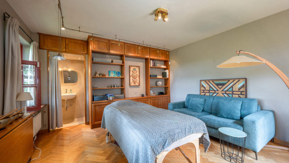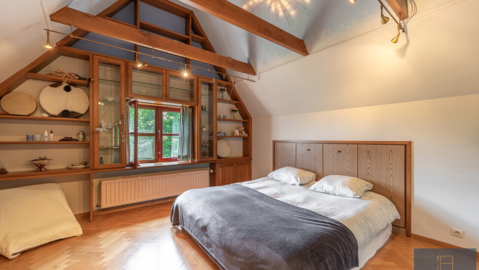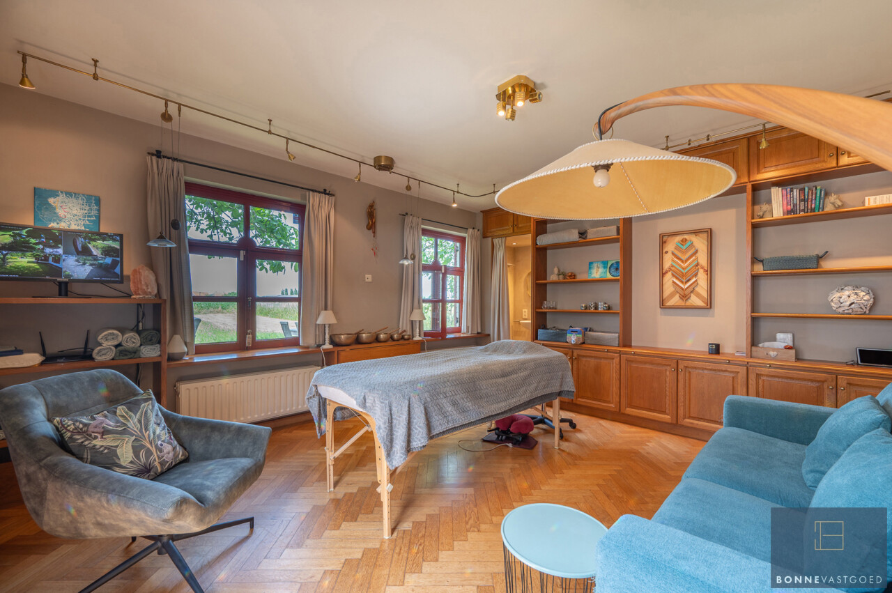 Buiten: groot garagegebouw met bergzolder (57m²), tuinberging, tuinberging, bijgebouw met sauna en bijgebouw/relaxruimte, boomgaard en weide.