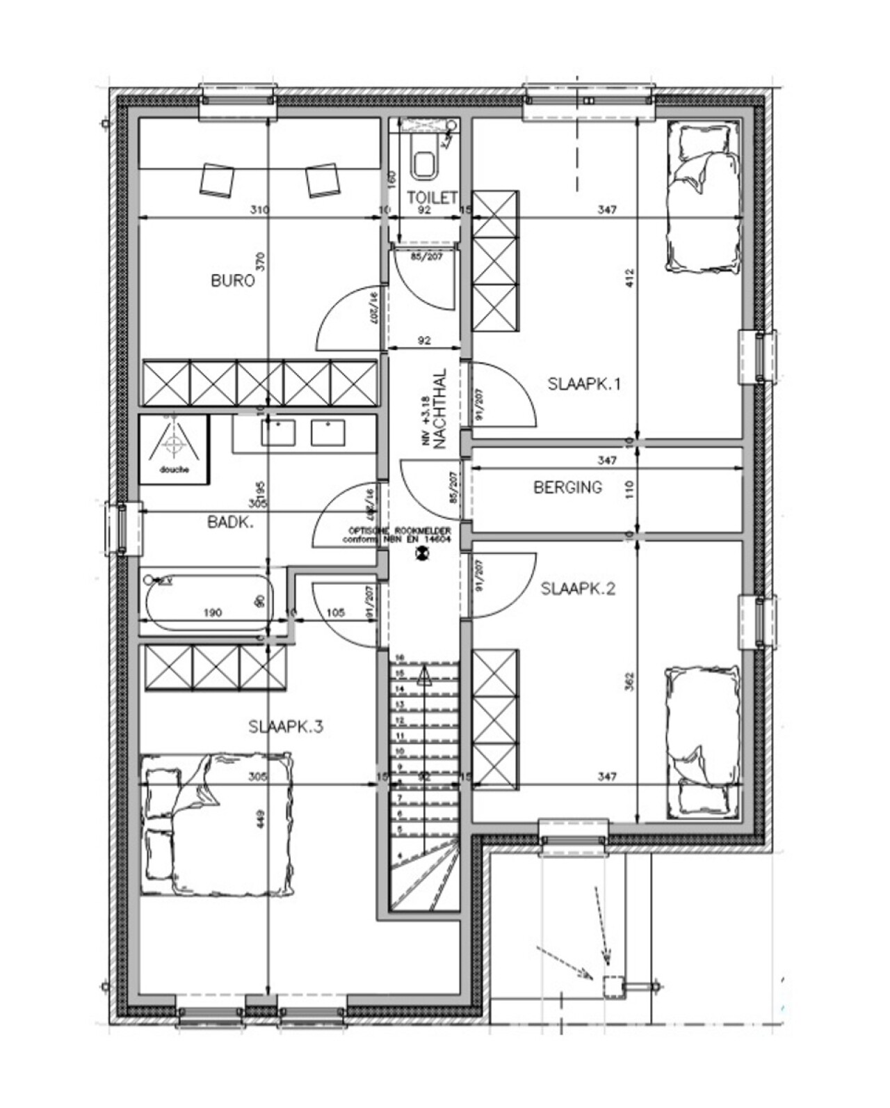 Eerste verdieping: 3 slaapkamers, toilet en badkamer (met ligbad, douche en lavabomeubel).