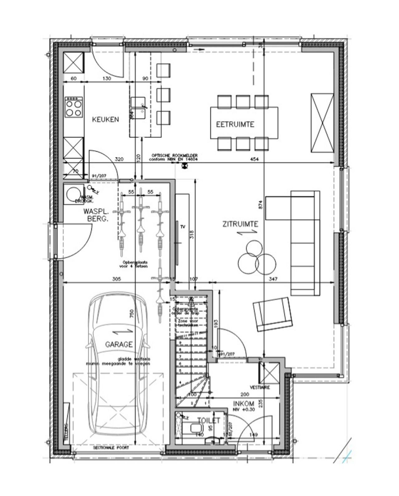 Gelijkvloers: inkom, gastentoilet, leefruimte met open keuken en garage.