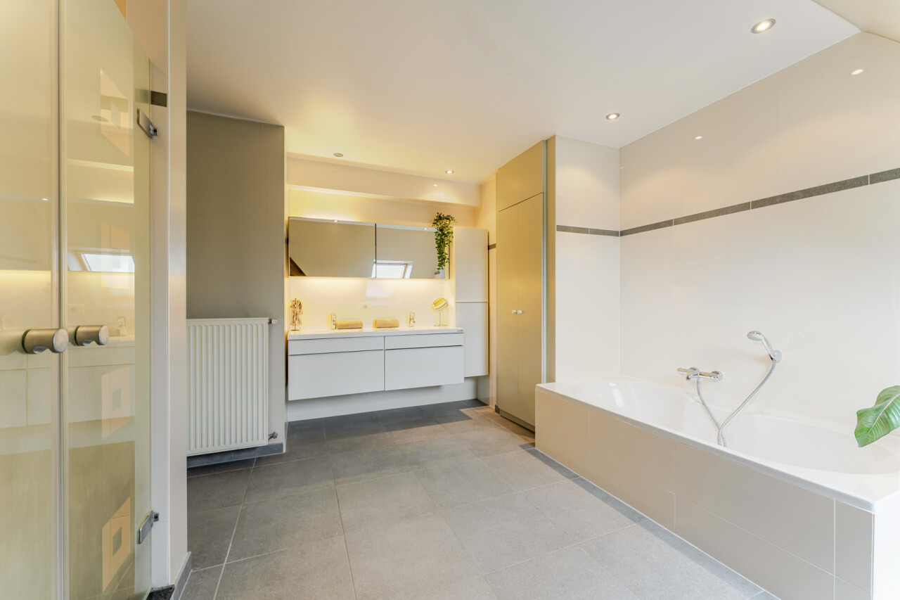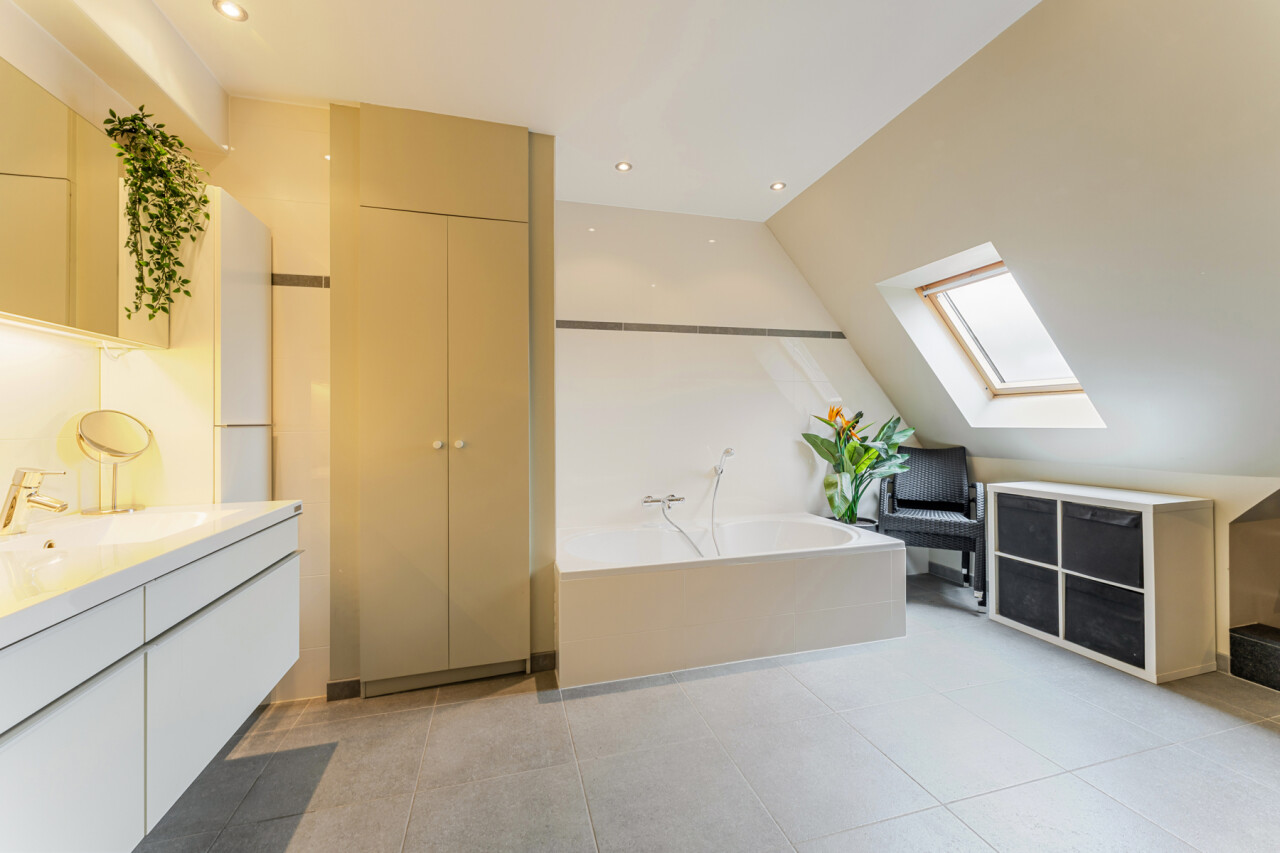 4e verdieping: 2 ruime slaapkamers – dressing – afzonderlijk toilet – badkamer met bad, douche en dubbele lavabo met balkon – praktische berging/wasplaats