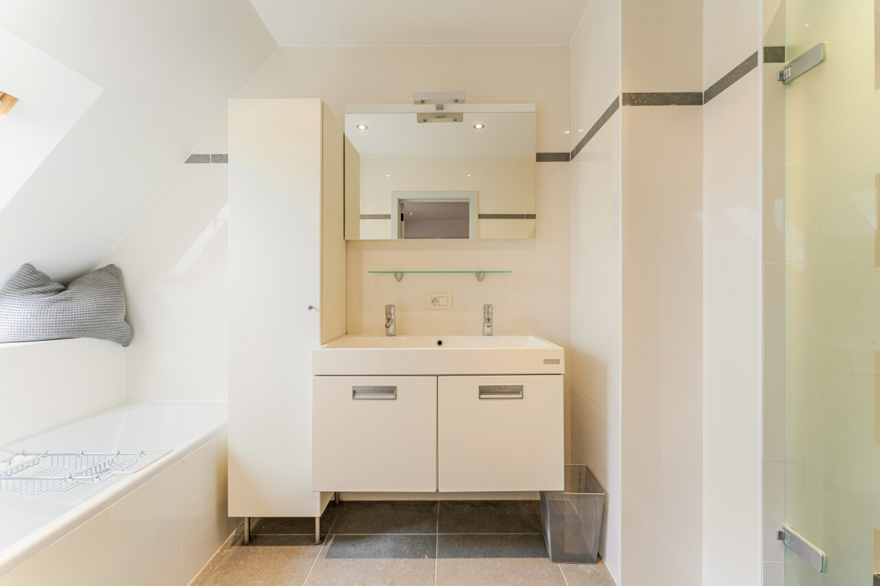 4e verdieping: 2 ruime slaapkamers – dressing – afzonderlijk toilet – badkamer met bad, douche en dubbele lavabo met balkon – praktische berging/wasplaats