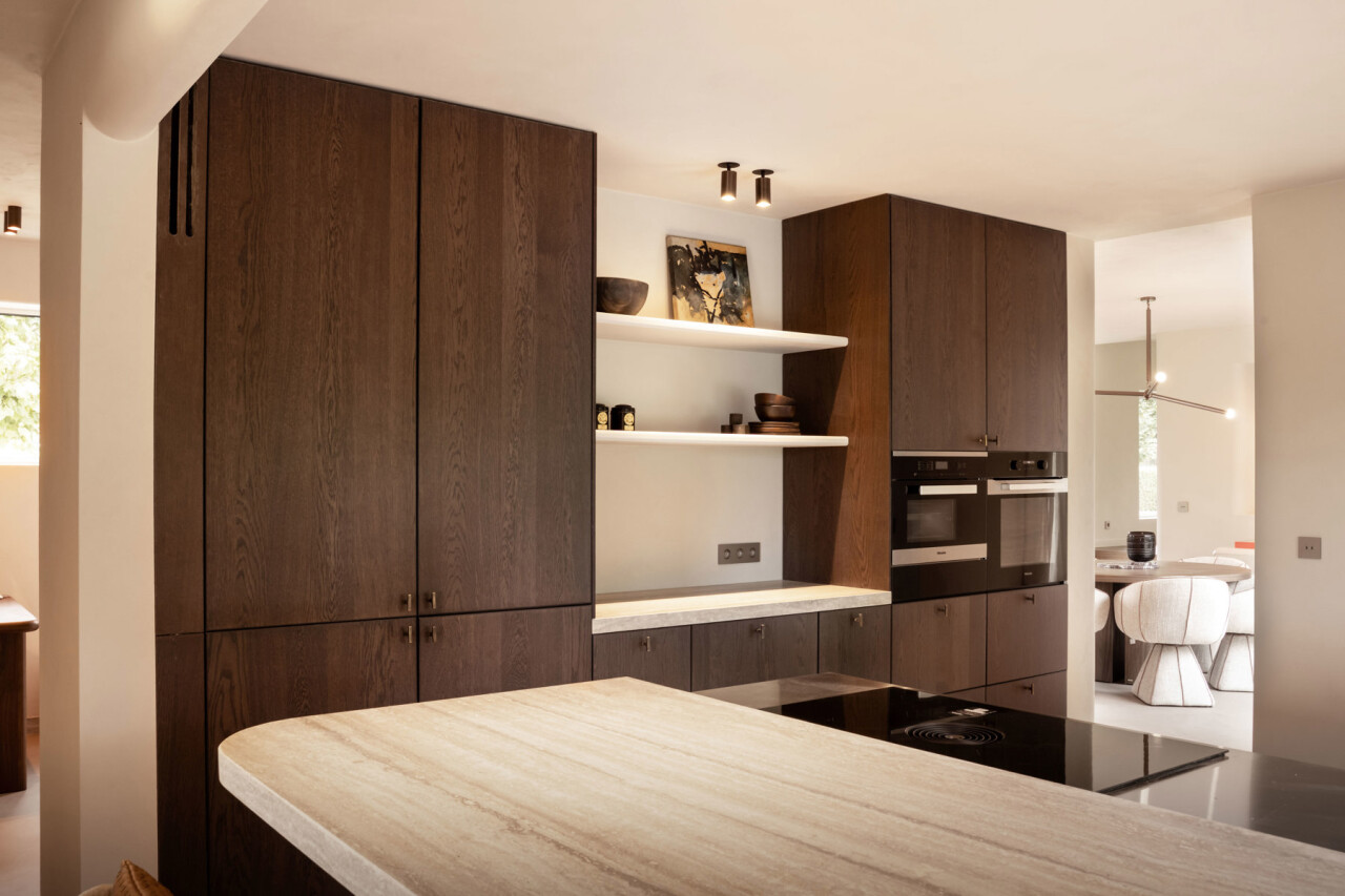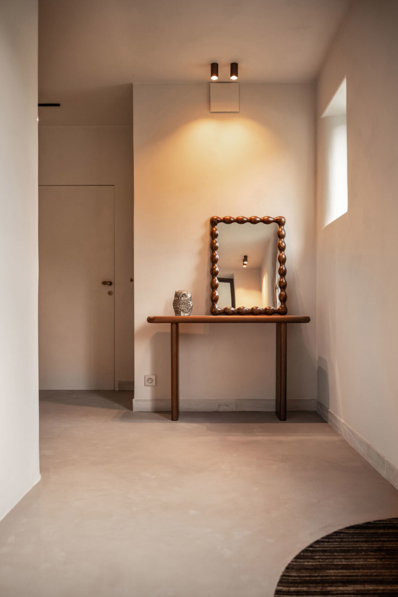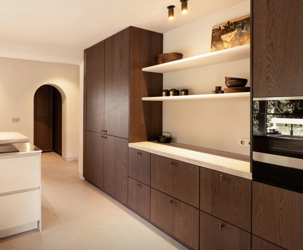 Het interieur straalt verfijning uit dankzij een minutieuze afwerking met afgeronde hoeken, schilderwerk in structuurverf, marmeren plinten, parketvloeren, Xinnix-deuren, stalen binnendeuren, een kwaliteitskeuken met koelcel en Miele-toestellen, en afwerkingen in travertin natuursteen.