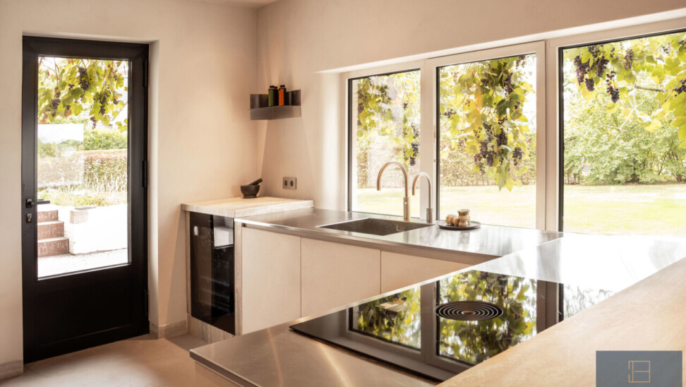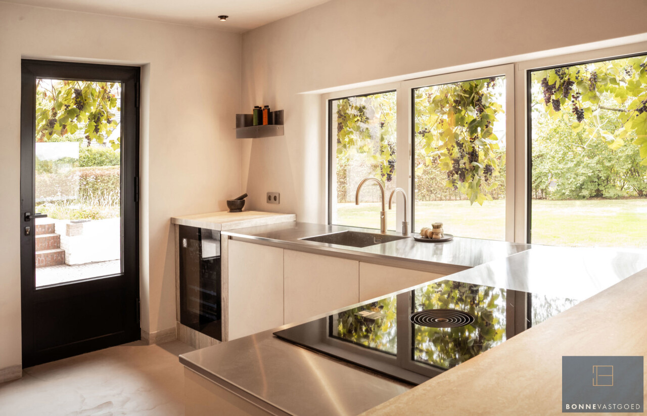 Het gelijkvloers omvat een inkomhal met gastentoilet, een lichtrijke leefruimte met eetplaats en open keuken met Quooker-kraan en Miele-toestellen (wijnkoeler, stoomoven, warmhoudlade, inductiekookplaat, vaatwasser, koelkast en diepvries). Verder zijn er een zithoek of ontvangstruimte met bar, wasplaats met douche en een polyvalent afgewerkte garage.