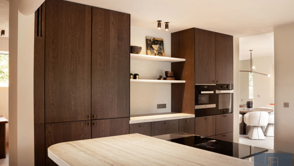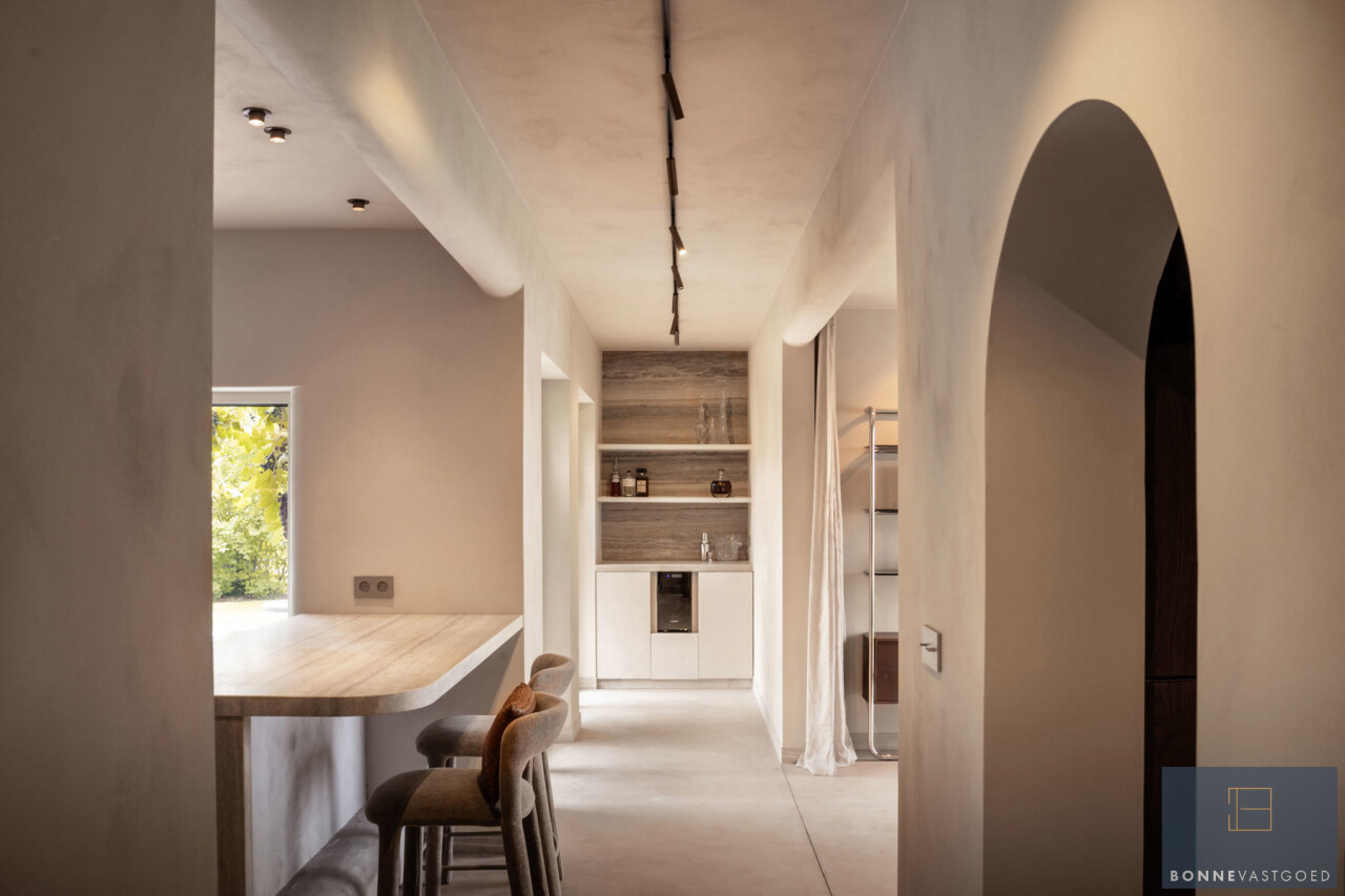 Het interieur straalt verfijning uit dankzij een minutieuze afwerking met afgeronde hoeken, schilderwerk in structuurverf, marmeren plinten, parketvloeren, Xinnix-deuren, stalen binnendeuren, een kwaliteitskeuken met koelcel en Miele-toestellen, en afwerkingen in travertin natuursteen.