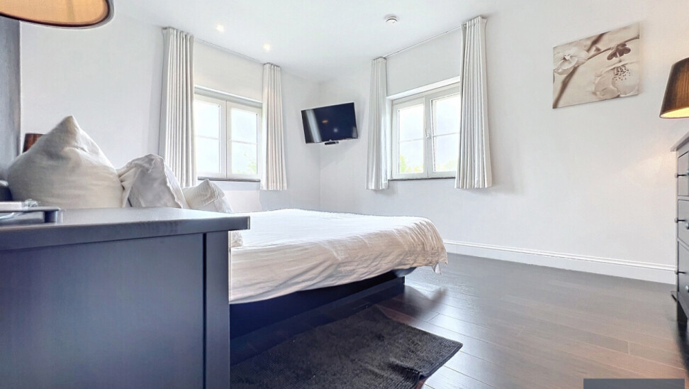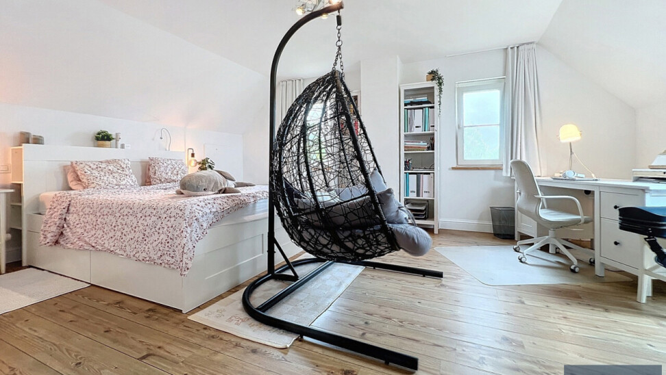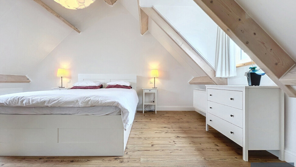 De slaapkamer boven de garage met aangrenzende strijkkamer kan perfect dienstdoen als gastenverblijf, studio of hobbyruimte.