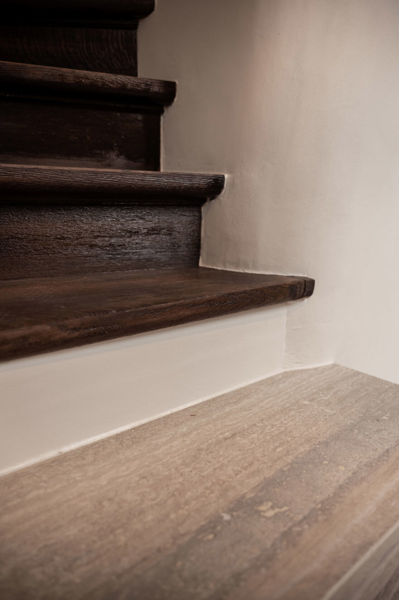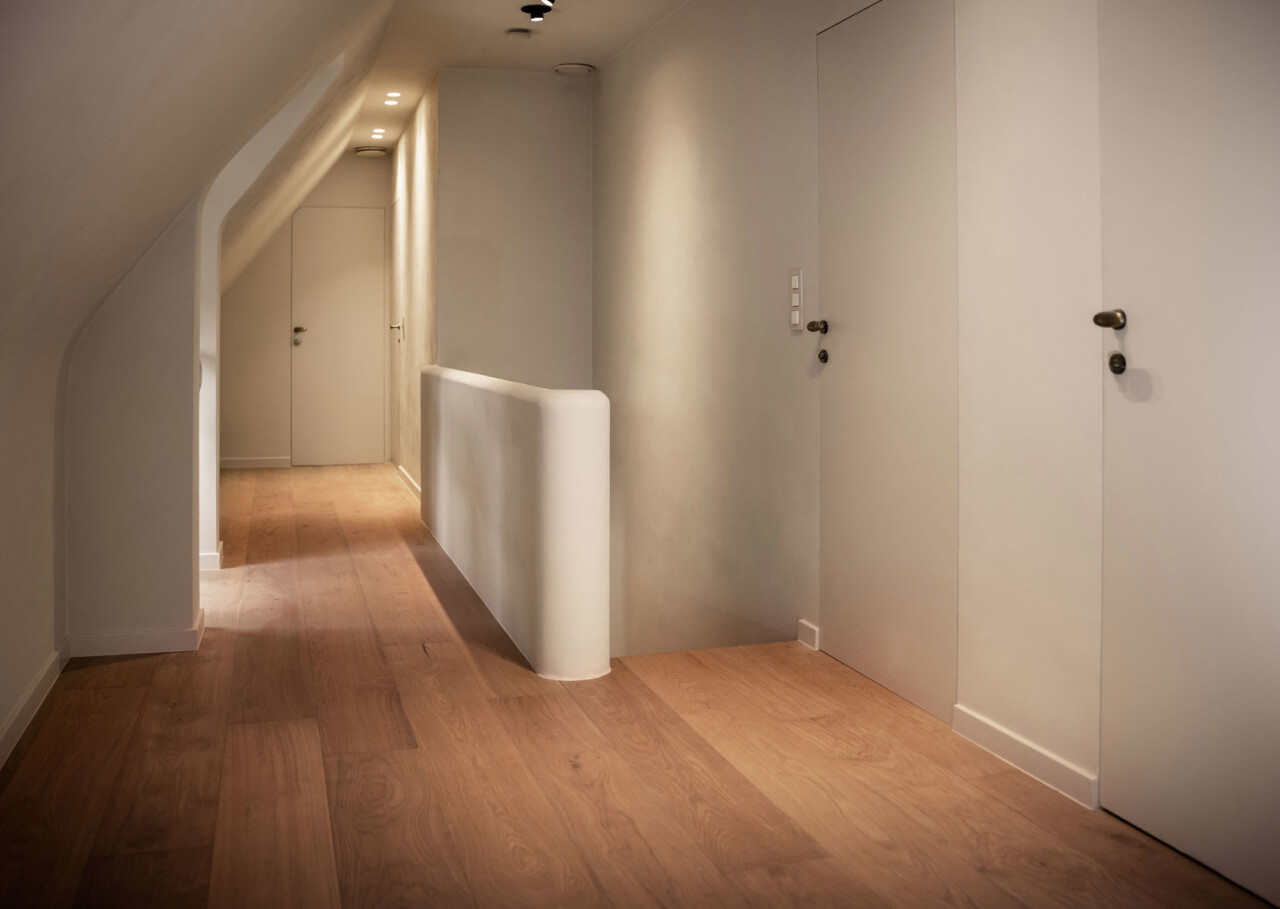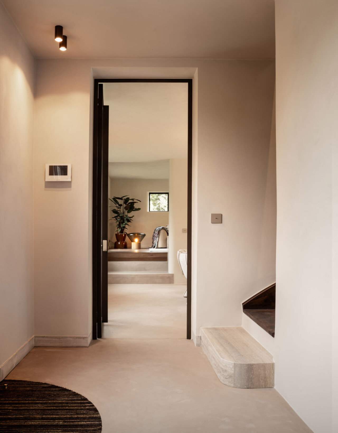 Het interieur straalt verfijning uit dankzij een minutieuze afwerking met afgeronde hoeken, schilderwerk in structuurverf, marmeren plinten, parketvloeren, Xinnix-deuren, stalen binnendeuren, een kwaliteitskeuken met koelcel en Miele-toestellen, en afwerkingen in travertin natuursteen.