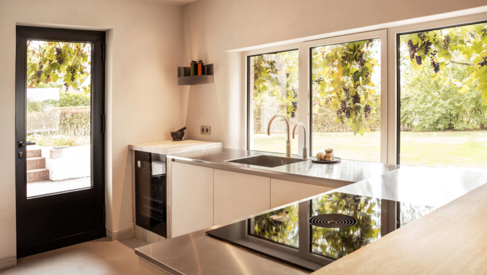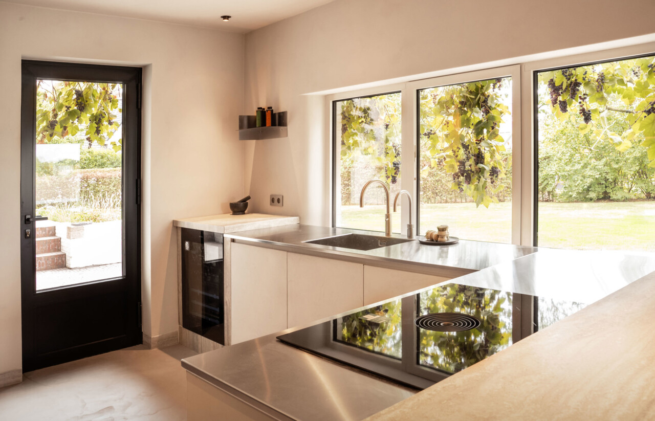 Het gelijkvloers omvat een inkomhal met gastentoilet, een lichtrijke leefruimte met eetplaats en open keuken met Quooker-kraan en Miele-toestellen (wijnkoeler, stoomoven, warmhoudlade, inductiekookplaat, vaatwasser, koelkast en diepvries). Verder zijn er een zithoek of ontvangstruimte met bar, wasplaats met douche en een polyvalent afgewerkte garage.